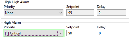 The purpose of this feature is to prevent system noise from repeatedly triggering alarms or cluttering the record with repeating events. For example, a high alarm with a setpoint of 80 and a deadband of 2 will trigger when the value reaches 80, and remain in the active state so long as the value is above 78. Without the deadband, if the value hovered above and below 80, then each time it crossed the setpoint a new "active" or "normalized" record would be recorded. - Delay - allows you to ignore a brief spike in value.