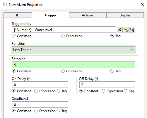 - Deadband - allows you to specify a range, within which the alarm will remain active if the triggering value retreats from the setpoint.