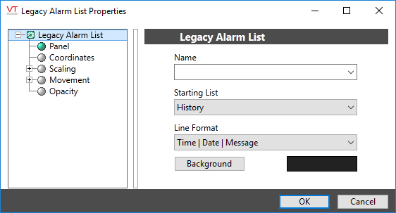 Provided for backward compatibility, this will create the legacy Alarm List, which existed in VTScada prior to version 11.2 Use the current Alarm List widget in all new applications.