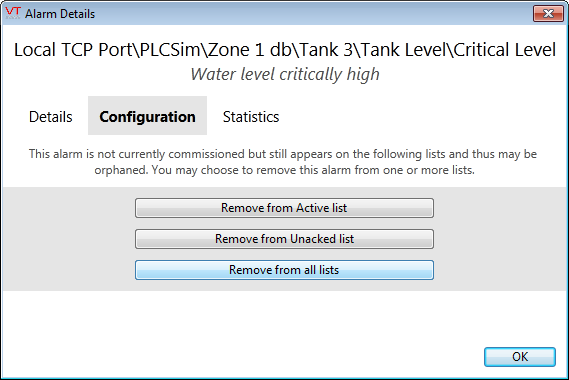 Use this dialog to remove the alarm from the lists. In most cases, it is advisable to remove orphaned alarms from all lists. Confirmation is required. (No record can ever be removed from the history list, but if a tag was deleted, the record will show only its unique ID. This is done to avoid confusion with any new tag that you might create using the same name as the deleted tag.)