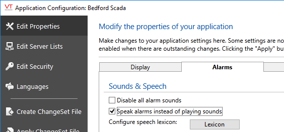 - You can select whether alarms should be spoken on all workstations, or on only the alarm server.