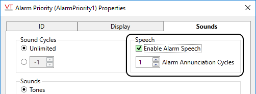The Enable Alarm Speech is selected and Alarm Annunciation Cycles set greater than zero.