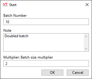 Control over running the batch is expected to remain with the PLC. VTScada's role is to provide sets of values for the recipe used in a batch, start the run (if allowed by the PLC), and report when the batch has finished (if that information is provided by the PLC).