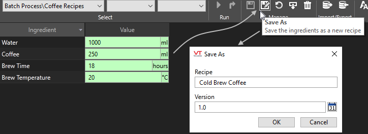 3) After creating the Recipe Book tag and a set of Recipe Ingredient tags, open The Recipe Page to set, retrieve, edit, and store ingredient amounts for each recipe in the Recipe Book. (It is possible, but rarely necessary, to build your own recipe page using the library of Recipe Management WidgetsAfter setting values for the ingredients that are included in a recipe, save them to a new recipe name. The option to set a version number is available only if you selected that feature when you created the Recipe Book tag.