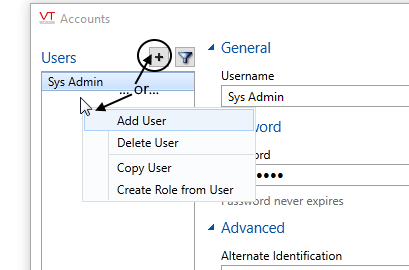 Use the Accounts dialog to create and manage all accounts and roles. Your account must have the Manager privilege. The following instructions are for creating an account, but apply identically to creating a role, excepting that roles do not have passwords, alternate identification or automatic sign off periods.