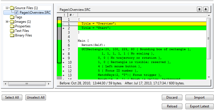 For source code and text files, you may review the changes, line by line before importing them. The new version of the line (in the file being imported) is marked in green and the old version (the current version in change control) is marked in yellow.