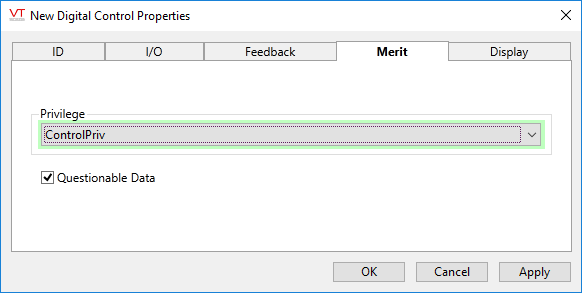 Most sites prefer to create a set of custom privileges in order to have control over which tags are available to which operators. You can assign a custom privilege to any tag that can write values to equipment. Anyone may view a control widget linked to that tag, but only users who have the correct privilege can use it to write a value to the PLC or RTU. (A user does not need the Control Outputs privilege in addition to their custom privileges.)