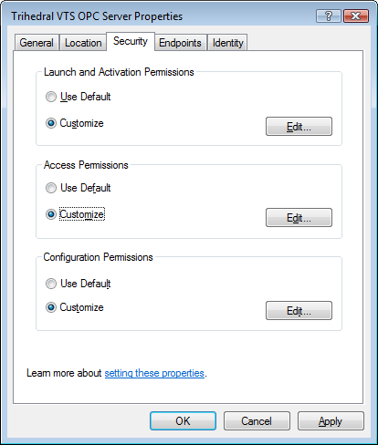 - Right-click on the Trihedral VTScada OPC Server entry and select Properties. The following dialog should open (shown with the Security tab selected):