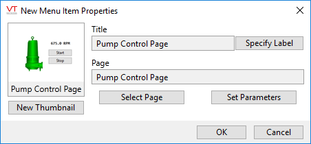 The New Menu Item Properties dialog now shows configuration options for a page. - Optionally, change the label, add parameter if this is a parameterized page, or select a different page.