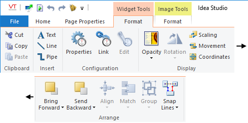 Many of the object creation, formatting and alignment tools, available to the Idea Studio, are stored in ribbons across the top of the page. Several ribbons exist, but only the Home ribbon will be visible at all times. Other ribbons contain properties or formatting tools and will be visible only you have selected objects of a given type.