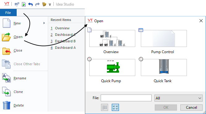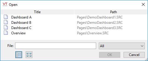 The "Open" dialog can display pages and widgets in a list format instead of the default preview format. This can be useful if you want to see the name of the file that each item is stored with.
