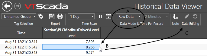 If the value at a selected timestamp exists only because it was entered manually using the Edit Historical Data dialog, then there is no logged VTScada value to which it can revert. In this case, the most recent value (logged or overridden) prior to the selected timestamp will be assigned. The manually-entered row cannot be deleted.