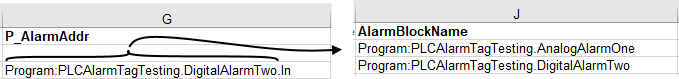 For each Custom PLC alarm tag, ensure that the *Address columns (P_AlmAddr, P_AckAddress, etc.) do not contain that tag’s AlarmBlockName. For each address that contains the text of that tag's AlarmBlockName as a prefix, either delete that tag's AlarmBlockName parameter to store this information in the addresses or delete the alarm block name prefix in the address columns. (This can be done with find and replace in the applicable cells.)