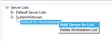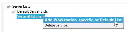 The following instructions use an existing tag (System Historian) to define a service-specific list. When creating a service-specific list for a driver or Historian, there is an advantage to creating the list first, typing in a name rather than selecting the existing tag. After the list has been created, create the matching tag using the same name. By doing so, you ensure that the service uses the custom server list immediately rather than using the default list for a period of time.