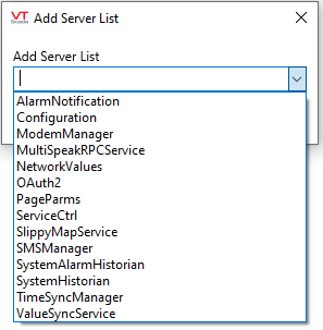 I/O services are selected by the Server List name you create for your device drivers if any. (See: Driver Server Lists) These will appear in the server list only while the application is running, as is the case with all tag-related services such as the SystemHistorian.