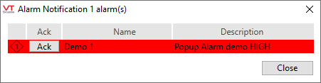 The pop-up will display the names of all active alarms for which the Pop-up option has been selected. As alarms are acknowledged, they will be removed from the pop-up. Should all the alarms be acknowledged while the pop-up is displayed, it will close. You may close the pop-up at any time by selecting the Close button. The pop-up will not be displayed again until a fresh alarm event occurs.