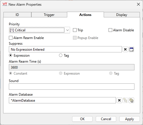 Users familiar with VTScada from before version 12.1.28 may expect to see an option to set an expression or tag for disabling an alarm. For that, use Suppress.