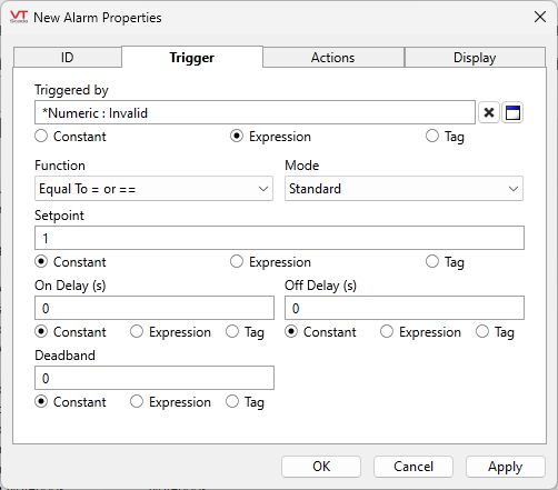 The valid value for the Setpoint field can be provided via any of a constant, an expression, or a tag. Please see Constant, Expression or Tag for help selecting which to use.