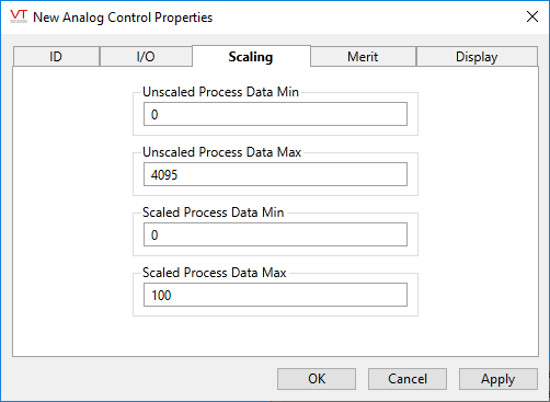 The Scaling tab is used to convert scaled data (intelligible to operators) into unscaled, raw data for the I/O device. VTScada uses an algorithm to calculate this tag's value internally, based on the known unscaled and scaled values you supply.