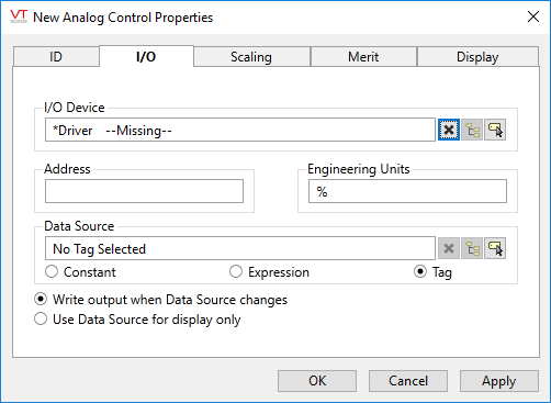 [Optional] While Analog Control tags usually take their value from an operator-controlled drawing object, the Data Source field provides the option of configuring this tag to accept a value from another tag or expression instead.
