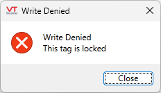 To inform the operator than a lock has been set (whether that lock prevents control or not), draw a Lock Level Icon Widget or on a page with the tag. If the Lock Level does not prevent control, no warnings are displayed; the icon or box widgets are the only indications that an information-only lock has been set. If the Lock Level prevents control, a warning message is displayed: