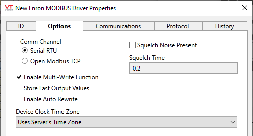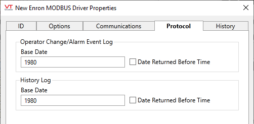 Many devices that communicate via Enron Modbus also maintain an internal historical log with periodic, hourly or daily records. Additionally, they usually have a separate log, which contains alarm and event data specific to the flow calculations that the device is monitoring. The Enron driver allows both of these logs to be read and then transferred to the VTScada historian.