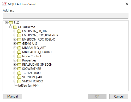If needed, the address assist can be made to switch back to the generic address entry mode using the "Manual" button, at the bottom left of the dialog when in Sparkplug B mode. (And, back to tree mode using the "Tree" button.)