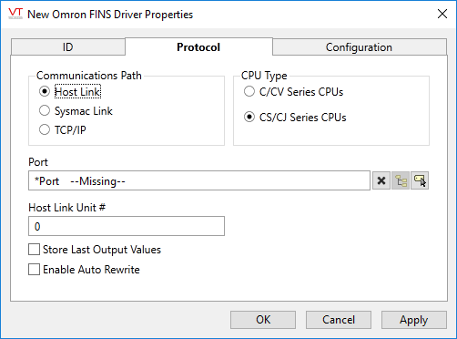 The selection of CV Series CPU vs. CS/CJ Series CPU enables the driver to adjust for differences between these two types of Omron units.