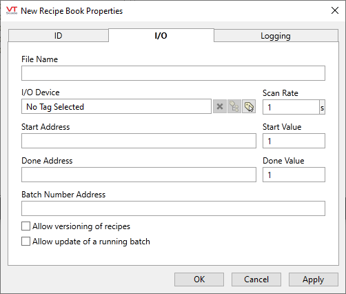 Both the Start Address and the Stop Address are optional. If not provided, VTScada cannot tell you when the batch starts or stops, but ingredient values will still be written.