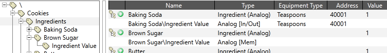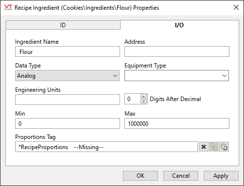 Each Recipe Ingredient tag has as a child I/O tag named Ingredient Value, which may be a memory tag, or may be used to read or write the value from or to the PLC. These I/O tags are configured using expressions and (in general) should not be edited directly. You cannot change the name of an Ingredient Value tag.