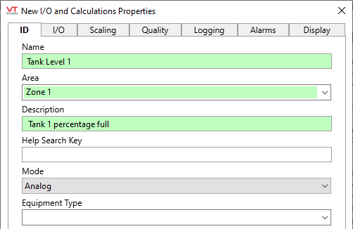 ID tab of the I/O tag's properties dialog. (Sometimes called a configuration folder.)