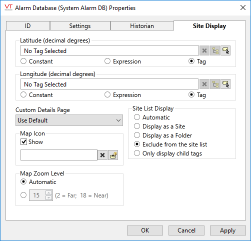Alarm Database tags are treated as containers, similar to the Context type and include all options for site display configuration.