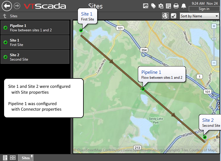 If you have created one or more sites, you can choose to configure another context tag as a connector. Connectors are drawn as a line (you configure the line style) between two sites that have latitude and longitude values. Connectors can have any properties you care to assign and any child tags you want, thus you can use them to represent pipes or transmission lines configured with all the characteristics you require.