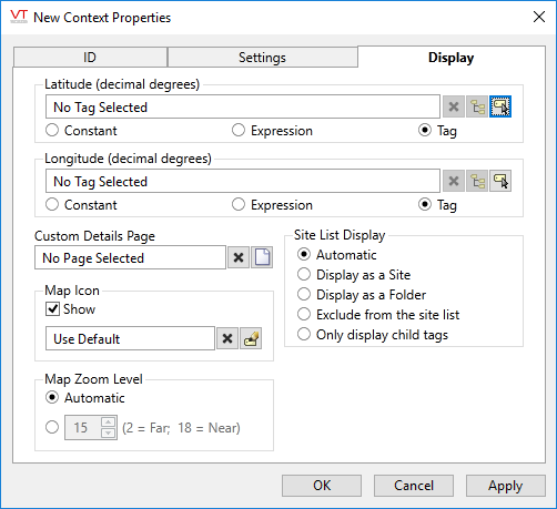 Context tags can be given site parameters, allowing them to be located on a site map. Related configuration parameters allow you to choose the icon that will represent the site and the page that will open when an operator clicks on that site. You can also configure how and whether the site will be shown in the Sites List page.