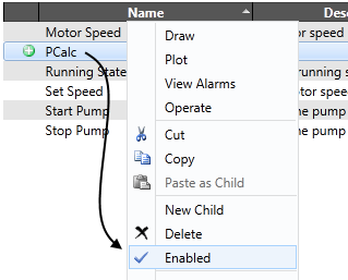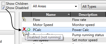 Tags can be disabled automatically by use of a Start Tag Expression in the Name field. This is often used when building tag structures automatically. For example, you might create a lift station or well that can have one to four pumps. The tags for Pump 2, Pump 3 and Pump 4 would be configured so that they will be disabled in stations where they are not required. See: Design Your Own Tags