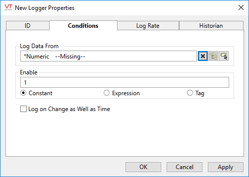 Enable or disable the logging of tag data by this logger using a constant value (either a 0, or a 1), an expression, or the value of a second tag.