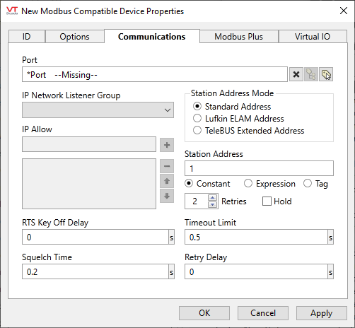 These properties are used to configure a virtual PLC in the memory of your PC. If using virtual addresses, and if your server is connected to the Internet, you may wish to enhance security by adding an IP Network Listener tag. See: IP Network Listener Tags