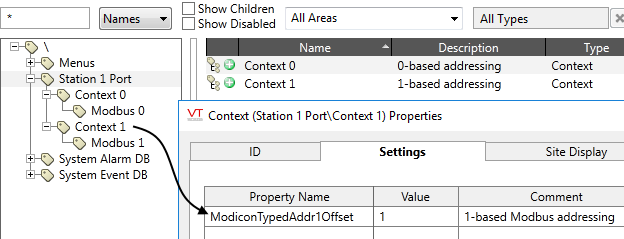 "Type specified" means addresses such as the HC1 and IR2 format. This does not apply to addresses written as numbers only. (For example, 40001 is always the first address in the 40000 block, and is equivalent to HR1 when ModiconTypedAddr1Offset is 0, or HR0 when ModiconTypedAddr1Offset is 1) If you change the property ModiconTypedAddr1Offset, it will be changed for all Modbus-compatible drivers in the application. If you need some drivers to be zero-based and others to be one based, you can achieve this by creating a parent Context tag for each driver, adding a property named ModiconTypedAddr1Offset to that Context tag. The child driver tag will take the value in the parent Context tag instead of the global property value. (See: Context tag properties, Settings tab)