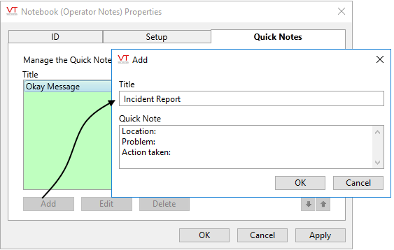 Add a Quick Note by clicking the Add button. Provide a title, which will be visible to operators when adding notes, and the text of the note.