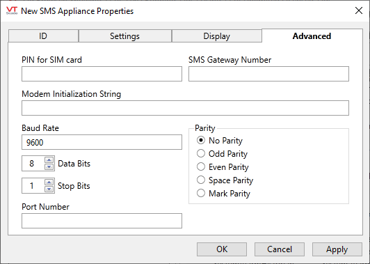 The fields in the Advanced tab are optional. These need not be set for most configurations and should be used only by developers who are familiar with the configuration of SMS devices.