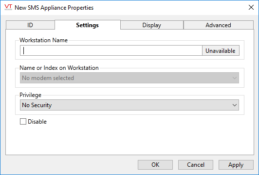 Because SMS appliances are usually installed as "modems" under MS Windows™, the configuration of the SMS Appliance tag enables the specification of this modem and the workstation to which the modem is attached. You may also set a security privilege, and if necessary, can mark the modem as disabled.