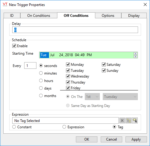 This tab is used to set the condition that will switch the tag’s value to 0, resetting the Trigger tag for the next scheduled event. The tag may be switched to an OFF state based on a delay in seconds after switching ON, a schedule, or based on an expression (which may include a tag).