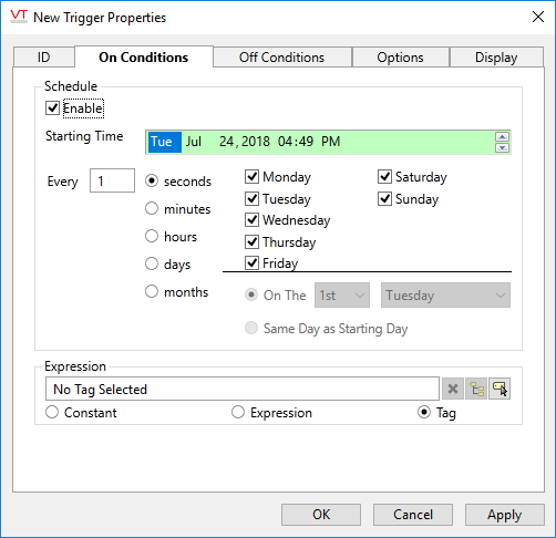This tab is used to set the condition that will switch the tag’s value to 1. The tag may be switched to an ON state based on a schedule or based on an expression (which may include a tag).