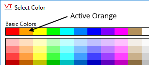 Active orange is defined as color 241 in the VTScada palette, or the RGB value, R=255, G=160, and B=0, with full opacity. ("<FFFFA000>"). In the Select Color dialog, it is the second color in the row of Basic Colors.