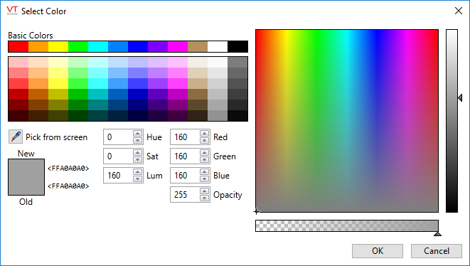 The Pick Color tool works within any VTScada window, even though the eyedropper image appears only within the Idea Studio. In other VTScada windows, clicking the standard pointer on any object will pick up that object's color for the selector.