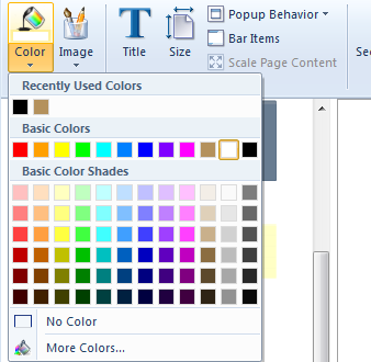In a few instances, such as when changing the background color of a page, a miniature color selector will be displayed. The miniature version is effective for quickly selecting a color when the full range of options is not required. Use the More Colors button in the miniature selector to open the full color selector.