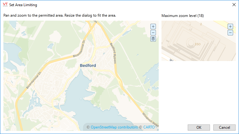 Within the Set Area Limiting dialog, use the larger map to set both the permitted area and the minimum (furthest) zoom level. If the map does not show the full area that you need at your minimum zoom level, resize the Set Area Limiting dialog to allow a greater (or smaller) area.