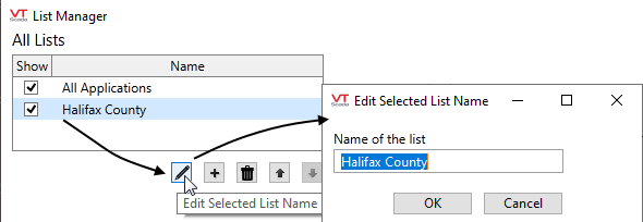 You must open an edit dialog to rename a list. Do so by selecting your list in the List Manager, then select the Edit Selected List Name tool.