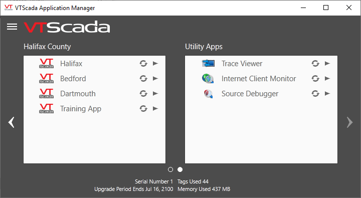 If your site has several applications, you can create lists in the VTScada Application Manager (VAM) in order to better manage those applications. Sites with few applications might choose to move the VTScada utility applications to a separate list.