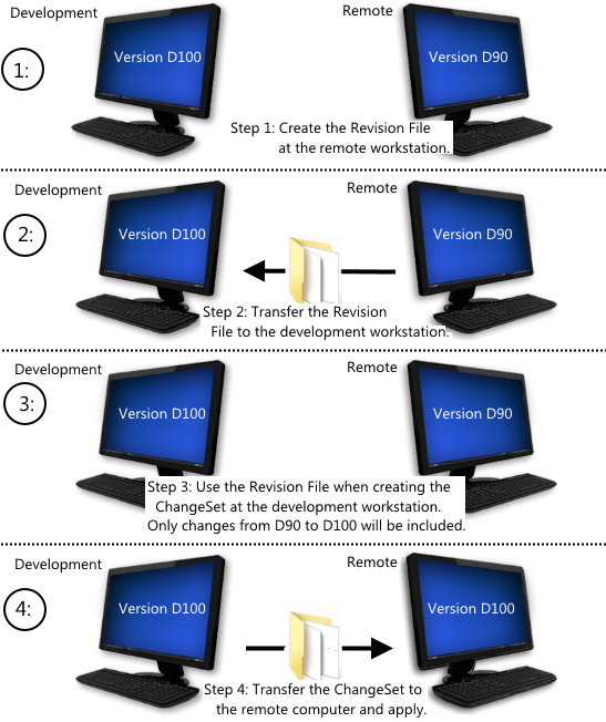 As a best practice, you should obtain an updated revision file from the remote computer immediately before generating a ChangeSet destined for that computer. The following example illustrates the process, where changes need to be transferred from a development workstation to a remote workstation. The steps would be the same, but on opposite computers if the transfer needed to go the other direction.